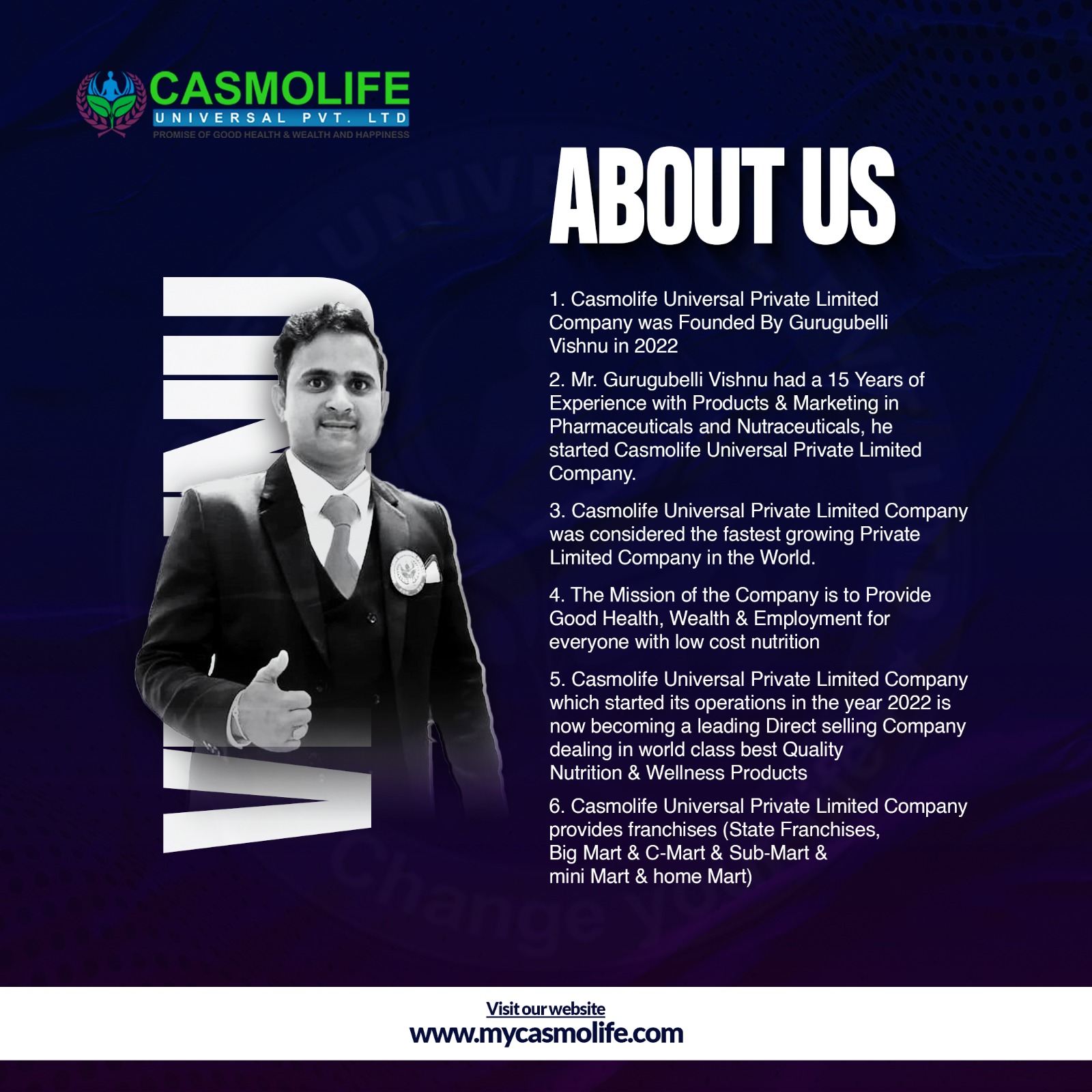 GURUGUBELLI VISHNU & GURUGUBELLI JHANSI started casmolife Universal Private Limited company with a good knowledge of pharmaceutical & Nutraceutical products having 15 years of experience.casmolife Universal Private Limited which is started its operations in the year of 2022 company dealing in world class wellness products.casmolife Universal Private Limited is constantly growing at a phenomenal rate every time.the growth rate in itself speaks volumes about the quality of the products .the marketing plan and the management that have been able to deliver such a rewarding and sustainable system Casmolife Universal Private Limited is constantly expanding its products range to introduce innovative wellness products every month .casmolife Universal Private Limited has been building a wide network of brand partners which is constantly growing in every month casmolife has continued enrich lives of every one who is a part of the company and those who believe in this health care and wellness products